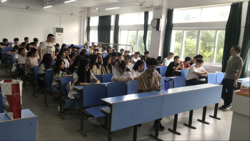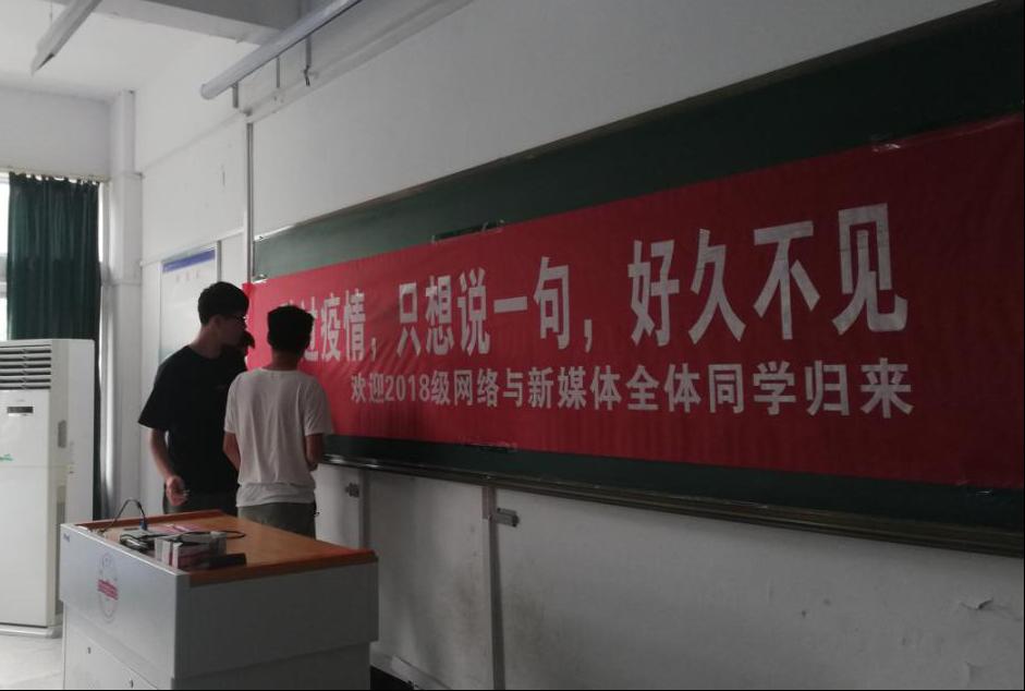 党总支副书记张万茂主持。“跨过疫情,只想说一句,好久不见”,学生刚进教室,就能看见长长的红色横幅上的这句话。横幅内容是辅导员老师精心挑选的,最能代表辅导员老师的心里话。