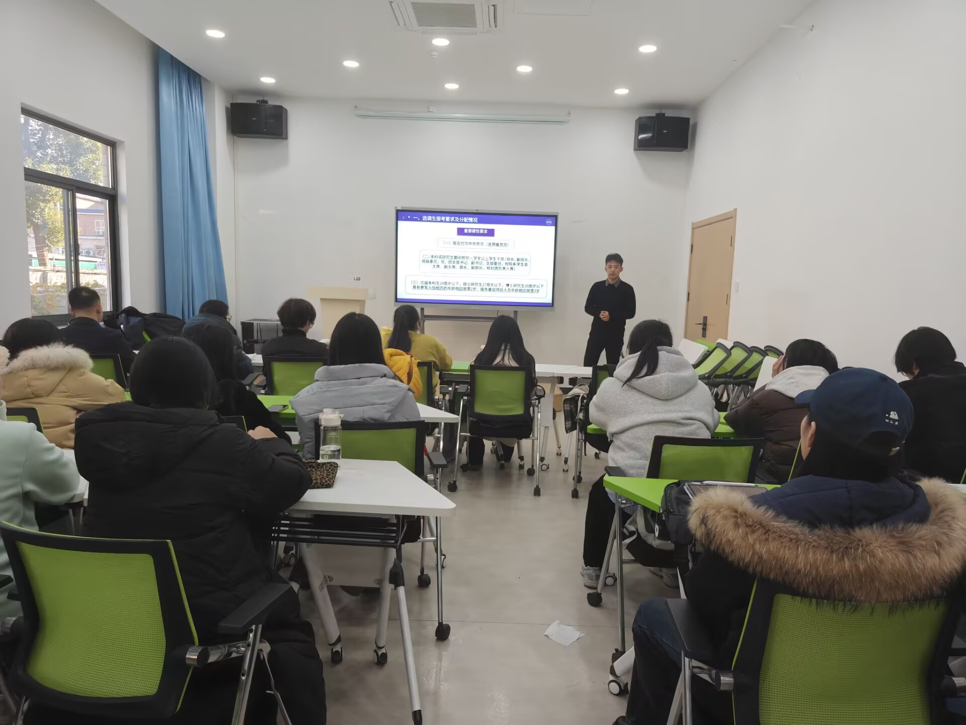 分享会上,詹海祥校友以“选调生的备考经验及成长经历分享”为主线,系统分享了自己在备考选调生过程中的心路历程、复习方法与实战经验。他结合自身在基层一线工作的初步体会,详细讲述了如何将在校所学转化为应对行政职业能力测验、申论写作及面试考核的实际能力。